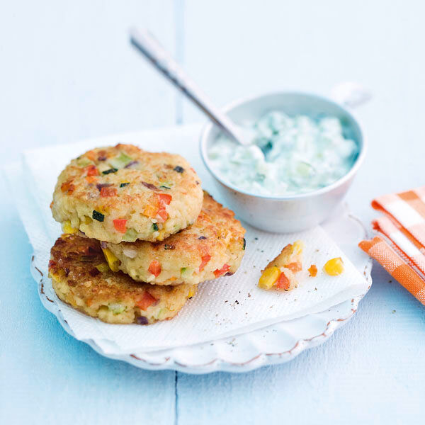 Eier verquirlen, mit Bulgur, Mais, Semmelbröseln, Mehl und Gemüse vermischen. Die Masse mit Salz und 2 Prisen Cayennepfeffer würzen. Aus der Masse mit feuchten Händen ca. 2 cm dicke Bratlinge formen. Das Butterschmalz in einer beschichteten Pfanne erhitzen, die Bratlinge darin auf jeder Seite ca. 5 Min. braten. Mit dem Gurkendip servieren.