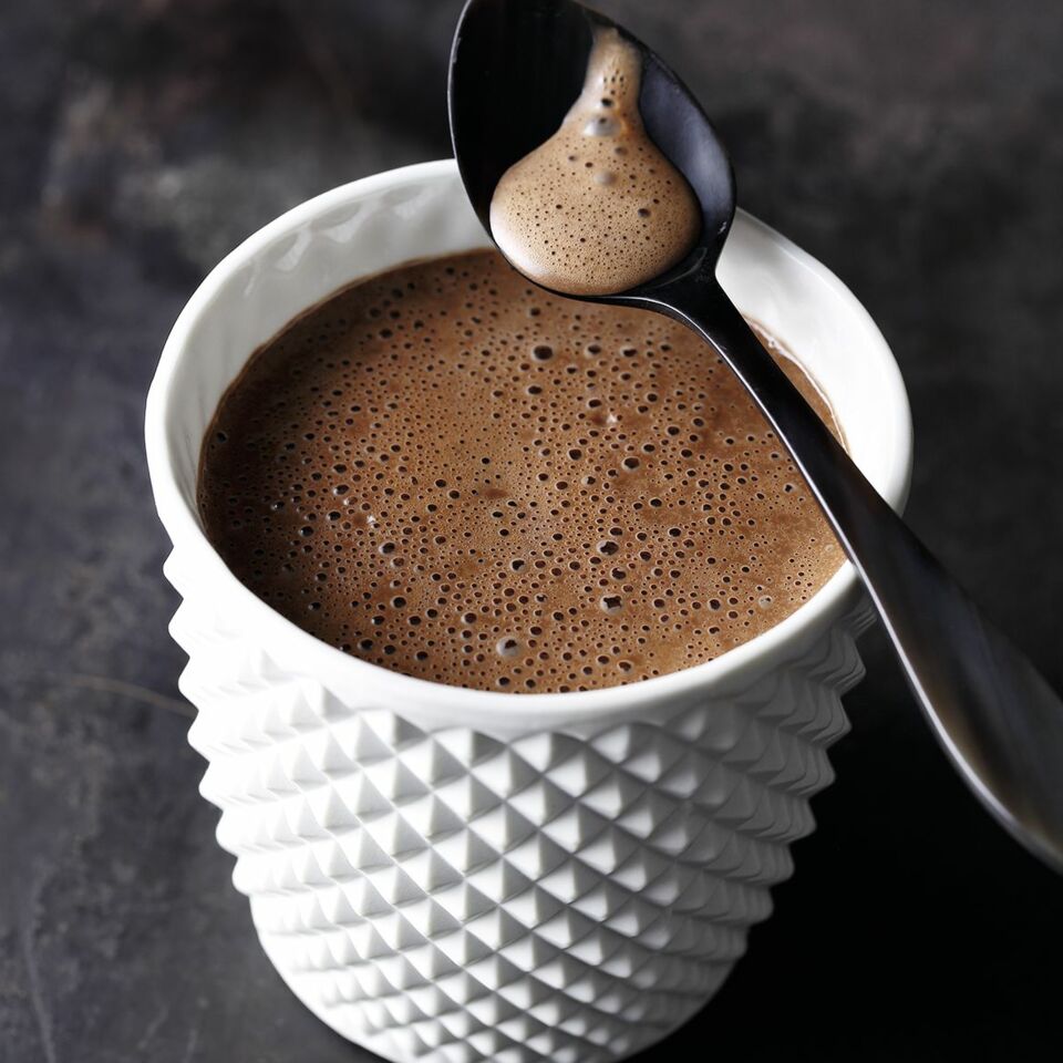 Die heiße Schokolade in einen hohen Rührbecher geben und mit dem Pürierstab pürieren, bis sich alle Zutaten verbunden haben und eine schöne Schaumschicht entstanden ist. In zwei vorgewärmte Tassen geben und servieren.