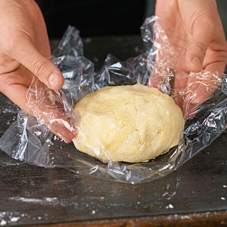 Den Teig zu einer Kugel formen, in Frischhaltefolie wickeln und im Kühlschrank ca. 30 Min. ruhen lassen. Die Form einfetten.