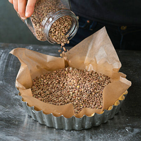 Bei Belägen, die nur kurz backen, den Teig mit Backpapier auslegen und Hülsenfrüchte einfüllen. Ca. 15 Min. »blind backen«.