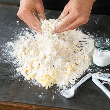 Das Mehl mit ca. 1/2 TL Salz mischen. Die Butter daraufgeben und alles zwischen den Händen zu feinen Bröseln zerreiben.