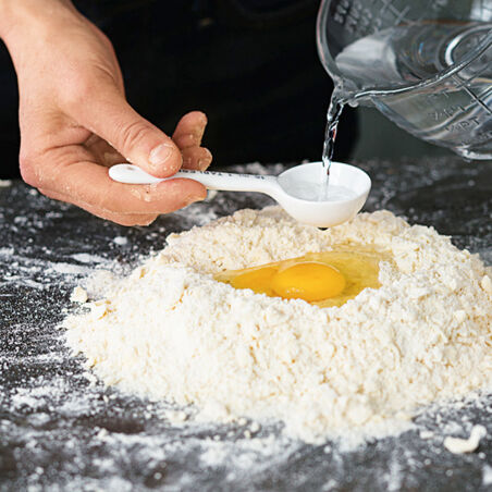 1 Ei, 2-4 EL Wasser (oder Milch bzw. 2 EL Weißwein/-essig plus Wasser) dazugeben und alles zu einem glatten Teig verkneten.