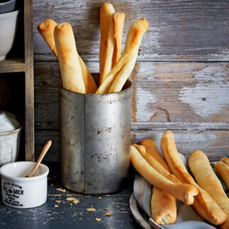 Den Backofen auf 250° (Umluft 230°) vorheizen. Jede Teigkugel auf einer Arbeitsfläche in ca. 15 kleine Stücke teilen und mit den Handflächen zu langen, dünnen Grissini ausrollen. Die Grissini nebeneinander auf zwei Backbleche legen und nacheinander im Backofen (Mitte) jeweils 5-8 Min. backen.