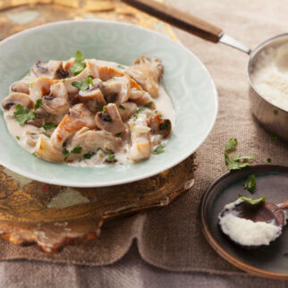 Den Mangold waschen und putzen, dabei in Stiele und Blätter trennen. Die Stiele in ca 5 cm lange Stücke schneiden, die Blätter halbieren. Stiele in kochendem Salzwasser ca. 1 Min. garen, die Blätter dazugeben, einmal aufkochen lassen, dann alles in ein Sieb abgießen, kalt abspülen und abtropfen lassen.