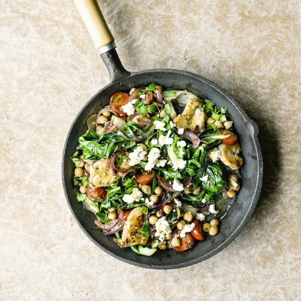 In einer weiten Pfanne das Öl erhitzen. Das Fleisch darin in zwei Portionen kräftig anbraten, mit Salz und Pfeffer würzen und herausnehmen. Die Zwiebelstreifen im Bratfett andünsten, dann Knoblauch, Mangoldstiele und Tomaten dazugeben und etwa 1 Min. mit andünsten. Mangoldgrün, Kichererbsen, Baharat, das Hähnchenfleisch mitsamt dem ausgetretenen Saft, Zitronensaft und Kräuter zugeben und unter Rühren kurz erhitzen.
