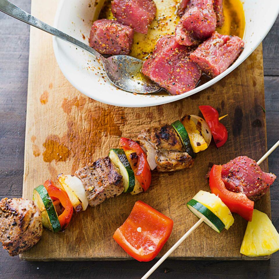 Fleisch aus der Marinade nehmen und mit Zucchino-, Paprika-, Ananas- und Zwiebelstücken auf die Spieße stecken. Die Spieße auf einen großen Teller oder ein Tablett legen, mit übriger Marinade beträufeln und noch 10 - 20 Min. ziehen lassen.