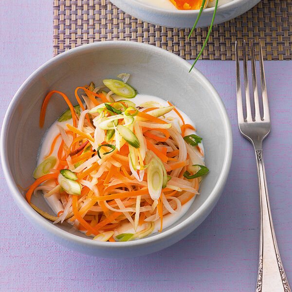Geben Sie Ihrer Möhrenrohkost einen asiatischen Touch und verfeinern Sie sie mit Sojasauce und Ingwer.