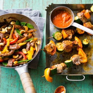 Bunte Garnelenpfanne mit Biss: Hier landen Zuckerschoten, Ananas, Paprika, Garnelen und Quinoa gemeinsam auf einem Teller. Cashews sorgen für den extra Biss.