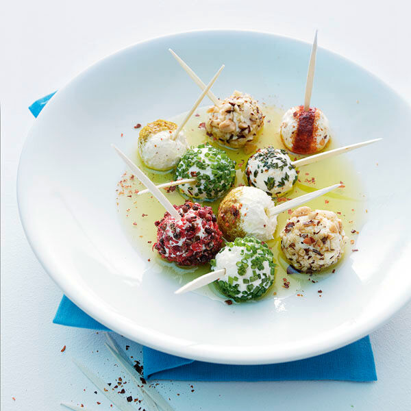 Dann den Käse nach Belieben in Schnittlauch, Thymian, Pinienkernen, roten Pfefferkörnern, Curry- und Paprikapulver wälzen und auf Holzspießchen stecken. Zum Servieren die Ziegenfrischkäse-Pralinen jeweils in eine Schale mit Olivenöl setzen.