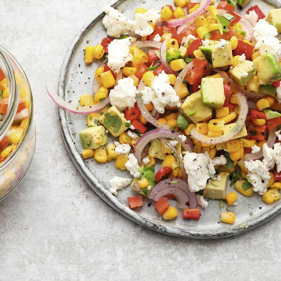 Mais, Tomaten, Zwiebel, Paprika, Avocado und Dressing mischen. Den Salat auf die Gläser verteilen, den Schafskäse darüberbröseln und die Gläser verschließen. Zum Servieren jede Salatportion auf einen Teller stürzen oder direkt aus dem Glas genießen.