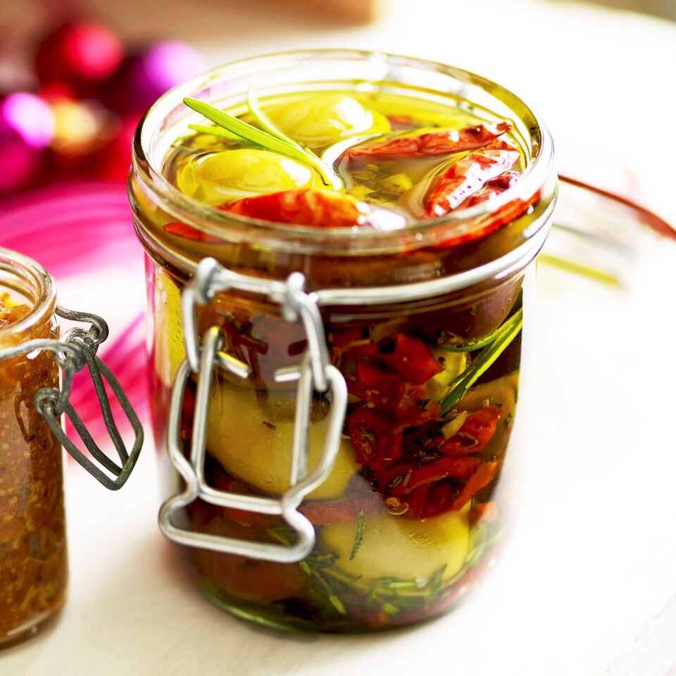 Die Tomaten in ein Sieb gießen, trocken tupfen und in Streifen schneiden. Mit Oliven unter die Knoblauchmischung rühren. Mit Fleur de sel, Pfeffer und Zucker würzen. Den Mix in saubere Gläser (am besten Twistoff- oder Bügelgläser) füllen. Mit dem restlichen Olivenöl bedecken, verschließen und mindestens 1 Woche ziehen lassen. Schmeckt zur Brotzeit, mit Pasta, Salat sowie Wein und Käse. Hält sich an einem kühlen Ort mindestens 4 Wochen.