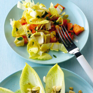 Die Salate waschen, putzen und gut abtropfen lassen. Den Chicorée in dicke Scheiben schneiden. Die Tomaten waschen und vierteln. Alles auf einer Platte anrichten.