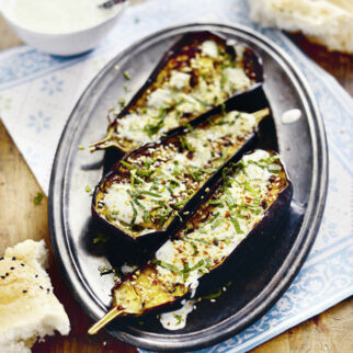 Den Backofen auf 200° vorheizen. Gemüse schälen oder waschen und putzen. Die Auberginen und (Süß-)Kartoffeln in 2 - 3 cm große Stücke, die Möhren in 1 cm dicke Scheiben schneiden. Zwiebeln schälen, halbieren und in 1 cm breite Spalten schneiden. Halloumi in mundgerechte Würfel, Oliven in grobe Stücke schneiden. Walnüsse grob hacken. Alle Gewürze, Salz und Sesam in einer kleinen Schüssel vermischen.