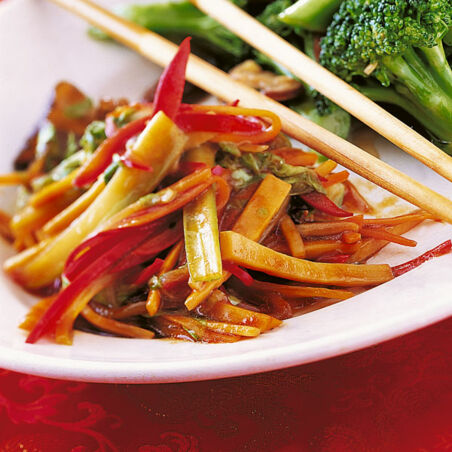 Gemüse und Wok - eine ideale Partnerschaft. Durch das schnelle Garen bleibt das Gemüse knackig und Vitamine optimal erhalten.