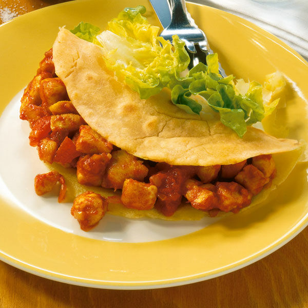 Den Backofen auf 50° vorheizen. Das Öl in einer beschichteten Pfanne erhitzen. Je 3-4 EL Teig in die Pfanne geben, mit einem nassen Löffel glatt streichen und von beiden Seiten knusprig braten. Die Burritos im Backofen mit Alufolie abgedeckt warm halten. Die heiße Füllung auf die Burritos geben und diese zusammenklappen. Sofort servieren. Dazu schmeckt grüner Salat.
