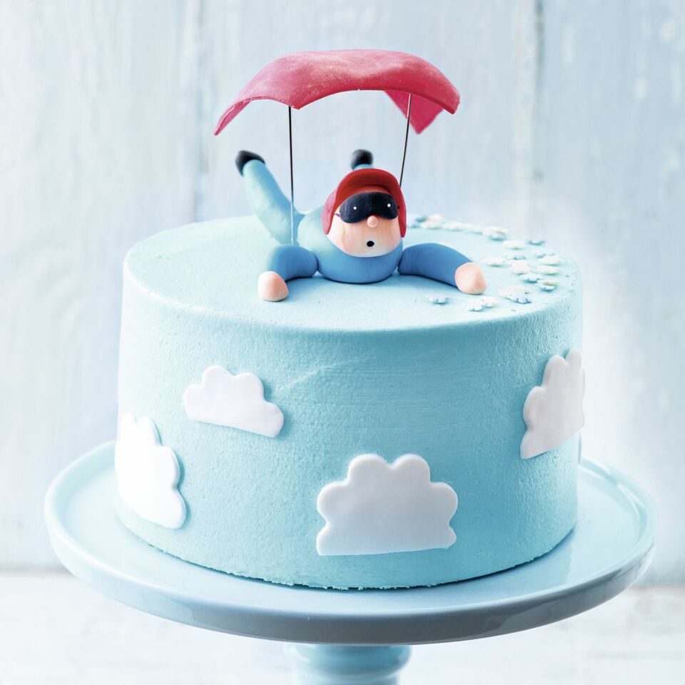 Für die Buttercreme Butter, Vanilleextrakt und einige Tropfen Lebensmittelfarbe in einer Schüssel cremig rühren. Den Puderzucker nach und nach darübersieben und unterrühren, bis eine streichfeste Creme entsteht. Die Torte mit der Creme rundum glatt einstreichen und ca. 1 Std. kalt stellen. Zuletzt die Wolken am Rand andrücken und den Fallschirmspringer auf die Torte setzen.