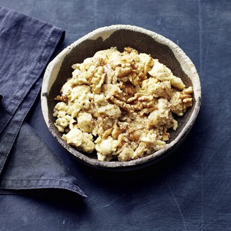 Zum Servieren das Rührei auf Teller verteilen und mit den Walnüssen garnieren.