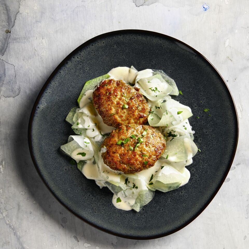 Die Kohlrabi schälen, in feine Scheiben schneiden und in kochendem Salzwasser bei mittlerer Hitze 1 Min. garen, in ein Sieb abgießen und abtropfen lassen. Crème fraîche und die Brühe in einen Topf geben und aufkochen lassen. Kohlrabischeiben zugeben, in der Sauce kurz aufkochen und mit Salz und Pfeffer abschmecken. Hackbraten mit Kohlrabigemüse auf vier Tellern anrichten, mit der restlichen Petersilie bestreuen und servieren.
