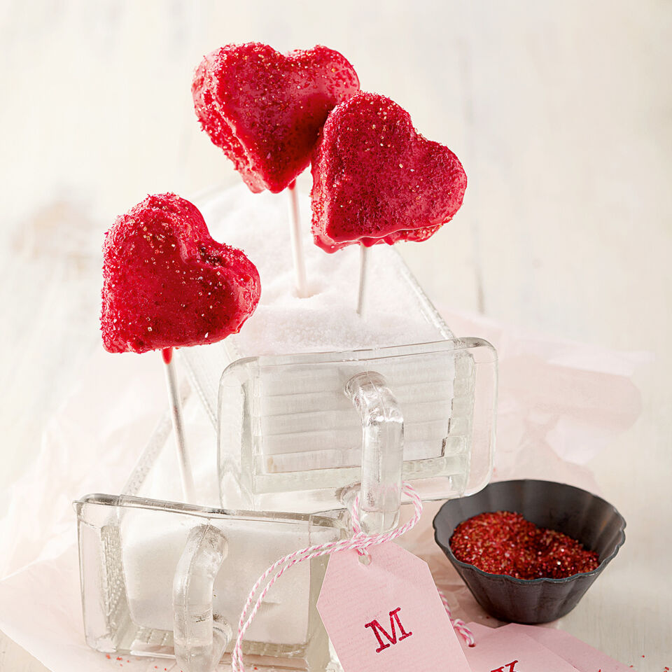 Diese Cake-Pops kommen von Herzen und in Herzform: Biskuit wird mit tiefrotem Guss überzogen, mit ein wenig Glitzer verziert und – mit Liebe verschenkt.