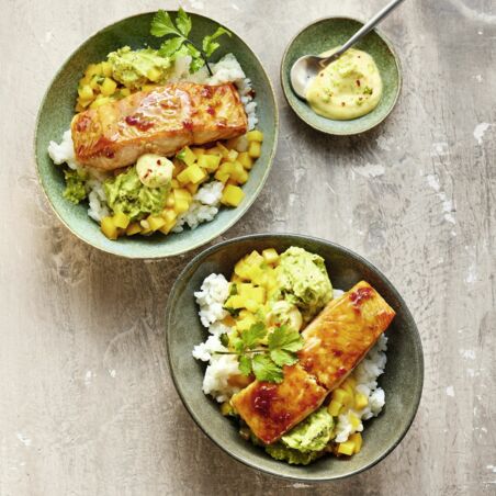 Die Mayonnaise mit Limettenschale und restlicher Sweet-Chili-Sauce (1 EL) verrühren. Den Reis auf vier Schalen verteilen. Mango-Salsa, Avocadocreme und Lachs darauf anrichten. Mit der Mayonnaise beträufeln und sofort servieren.