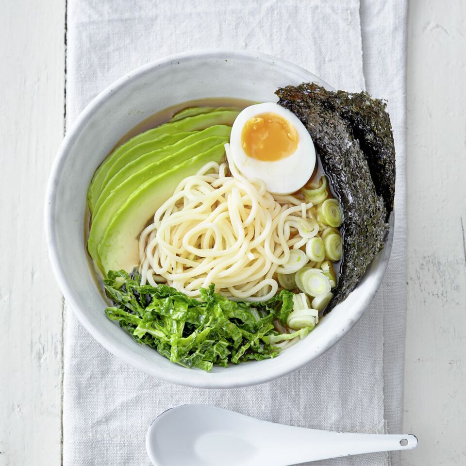 Den heißen Fond in die beiden Schalen gießen, die Nudeln zugeben und mit einer Gabel spiralförmig aufdrehen. Ei, Avocado, Grünkohl und Frühlingszwiebel darauf anrichten. Je 2 Nori-Blätter seitlich an den Schüsselrand stecken und die Ramen sofort servieren.