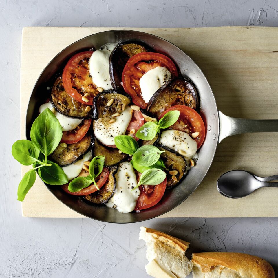 Mit karamellisierten Balsamico-Auberginen hauchst du in der Pfanne dem in die Jahre gekommenen Caprese-Klassiker neues Leben ein.