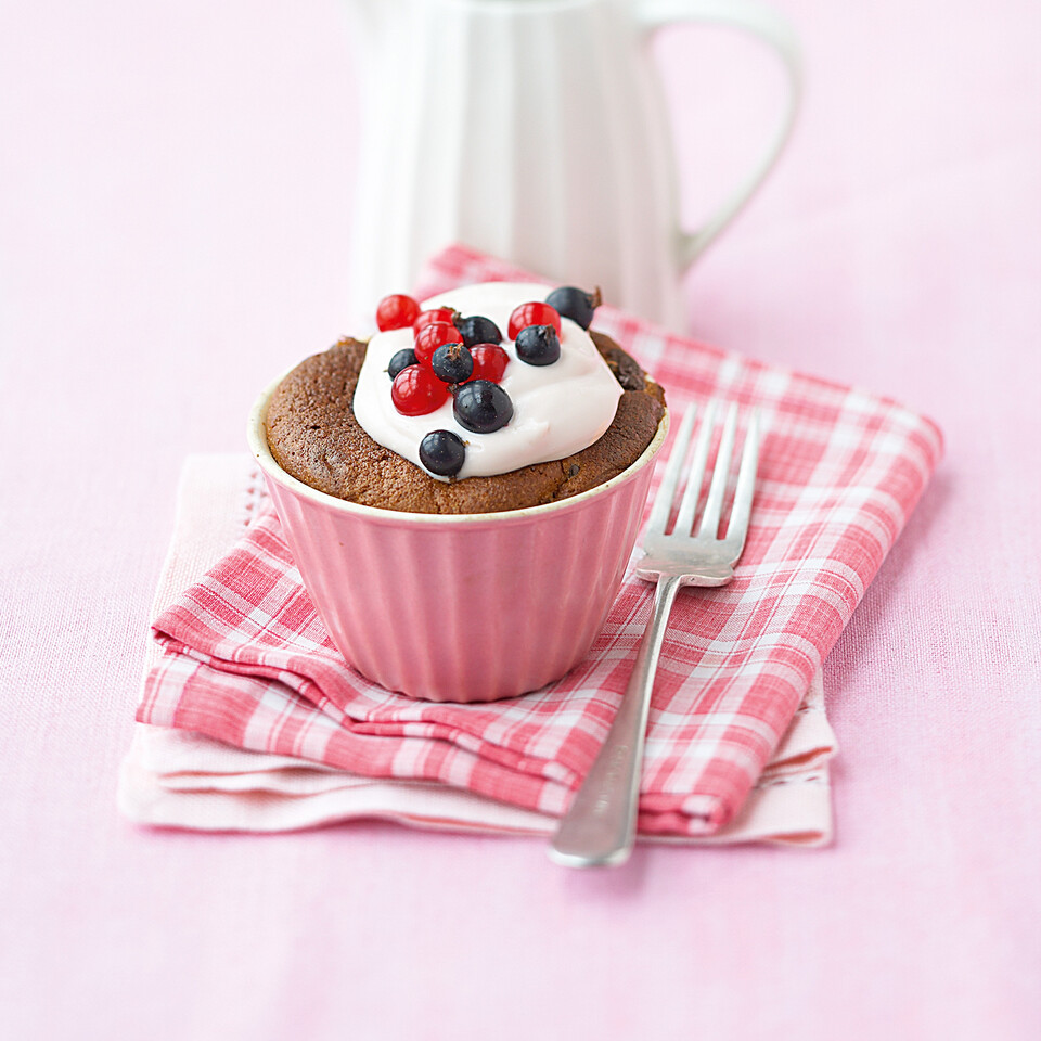 Die Papierförmchen in die Mulden setzen. Den Teig einfüllen. Im Ofen (Mitte) ca. 20 Min. backen. Die Form herausnehmen, kurz abkühlen lassen, dann die Cakes aus den Formen lösen und auskühlen lassen. Je einen Klecks Crème double auf die Cakes setzen und mit den Beeren verzieren.