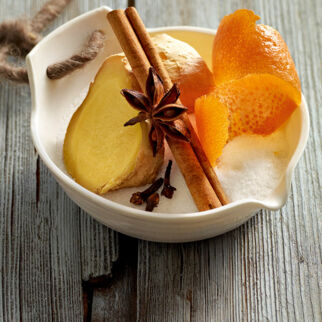 Orangen heiß waschen und abtrocknen, von 1 Orange ein breites Stück Schale dünn abschneiden, den Saft beider Orangen auspressen. Orangensaft und -schale, Wein, Zucker und Gewürze in einen Topf geben und zum Kochen bringen, dabei den Zucker unter Rühren auflösen. Den Sud offen 5 Min. bei mittlerer Hitze kochen lassen.
