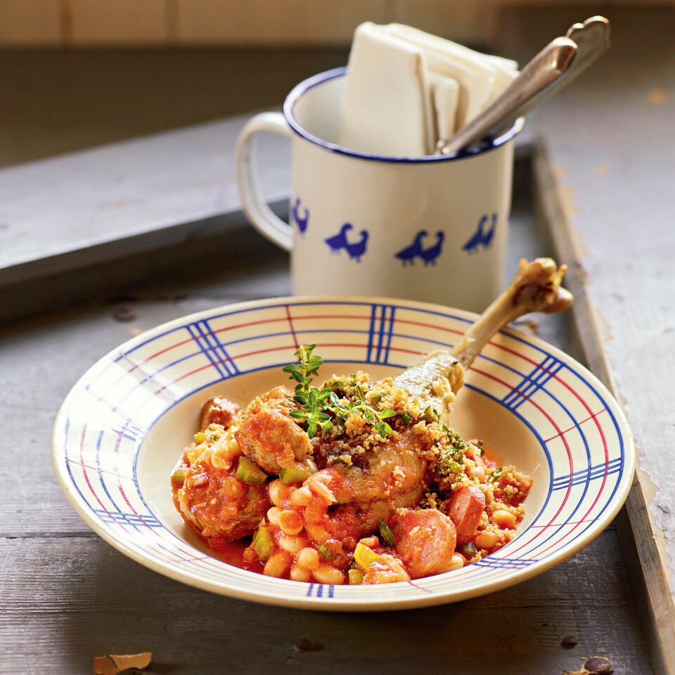 Eine ofenfeste tiefe Tonform oder einen Bräter mit den Speckwürfeln ausstreuen. Darauf die Bohnen-Fleisch-Masse geben und die Gänsekeulen einlegen – sie sollen mit Bohnen bedeckt sein. So viel Bohnensud dazugießen, dass die Bohnen knapp bedeckt sind. Cassoulet offen in den Ofen stellen und (unten, Umluft 140°) ca. 1 Std. garen.