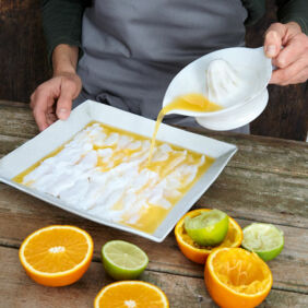 Das Fischfilet waschen und gut trocken tupfen. Das Filet in hauchdünne Scheiben schneiden und möglichst flach in eine niedrige Form schichten. Den Saft der Limetten und der Orange auspressen und über den Fisch gießen. Abgedeckt im Kühlschrank etwa 3 Std. durchziehen lassen.