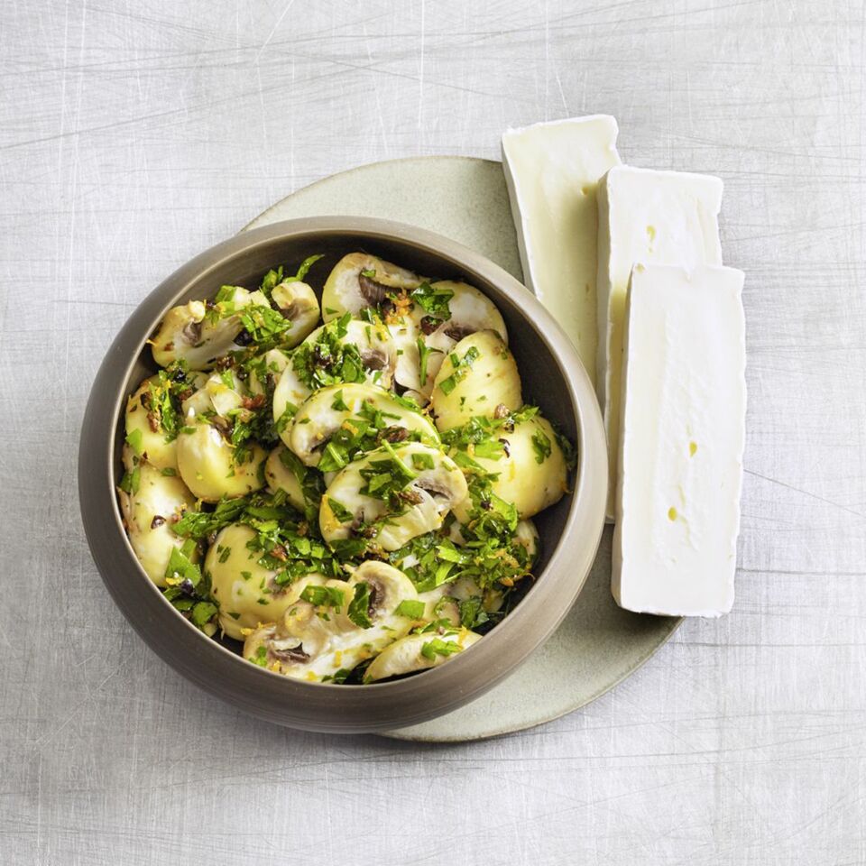 Die Champignons putzen und in möglichst dünne Scheiben schneiden. Mit Orangenschale, Wacholderbeeren, Petersilie, Olivenöl, Salz und Pfeffer mischen. Den Käse in knapp 1 cm dicke Scheiben schneiden.
