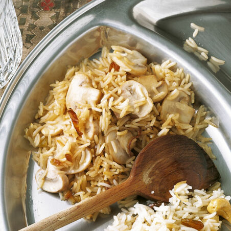 Als Beilage fast zu schade: dieses indische Reisgericht, das schon für sich eine kleine Köstlichkeit darstellt. Ganz besonders gut passt der Reis zu scharfem Lamm-Curry.