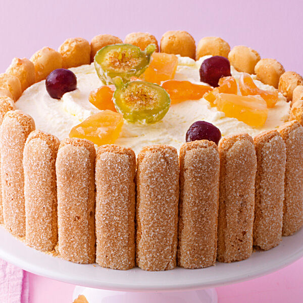 Eine Tortenplatte mit Backpapier belegen, den Tortenring daraufstellen. Von den Löffelbiskuits an einem Ende etwa ein Drittel gerade abschneiden, die Stücke im Gefrierbeutel zerbröseln und auf den Boden streuen. Die übrigen Löffelbiskuits an den Rand des Tortenrings stellen. Die Creme einfüllen, die restliche Sahne darauf verteilen. Die Charlotte abgedeckt 3 Std. kalt stellen. Mit den übrigen kandierten Früchten garniert servieren.