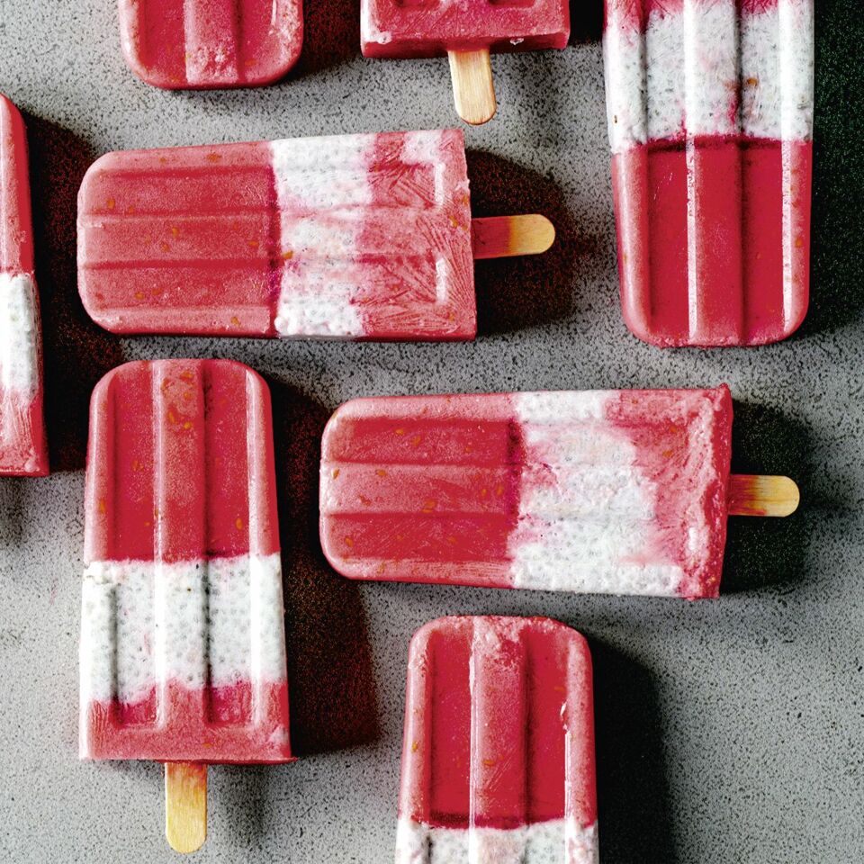 Eis am Stiel kann so gesund und lecker sein: Chia-Samen in Kokosmilch plus fruchtige Himbeermasse ergeben eine cremige Erfrischung am Stiel.