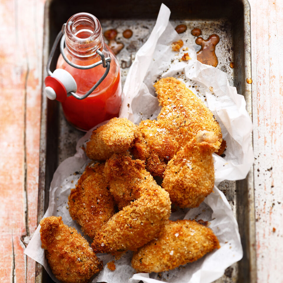 Inzwischen die Hähnchenflügel im Mehl wenden und das überschüssige Mehl gut abklopfen. Dann die Flügel durch das Ei ziehen, kurz abtropfen lassen und zum Schluss im Panko wenden. Die Hähnchenflügel portionsweise im heißen Öl in ca. 10 Min. knusprig braun frittieren. Mit einer Schaumkelle herausheben, kurz auf Küchenpapier entfetten und sofort servieren.