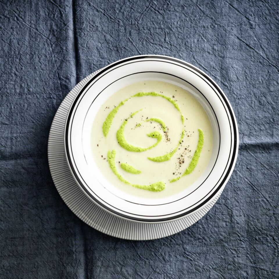 Chicorée-Cremesuppe mit Feldsalat-Pesto