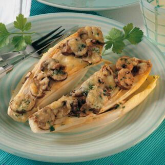 Chicoréehälften mit den Schnittflächen nach unten nebeneinander in die Tomatensauce legen. Bei schwacher Hitze zugedeckt 25 Min. dünsten.