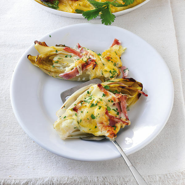 Den Backofen auf 190° vorheizen. Die Form mit Butter einfetten. Die Chicoréehälften in die Form legen, salzen und pfeffern. Frühlingszwiebeln, die Hälfte der Petersilie und den Schinken darauf verteilen. Die Béchamelsauce darüber gießen. Mit übriger Petersilie und Käse bestreuen. Im Ofen (Mitte, Umluft 170°) ca. 25 Min. backen.