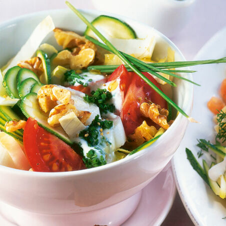 Auf den ersten Blick ein typischer WIntersalat mit Chicorée und Walnüssen, doch Tomate und Joghurtsauce verleihen ihm einen durchaus sonnigen Zug.