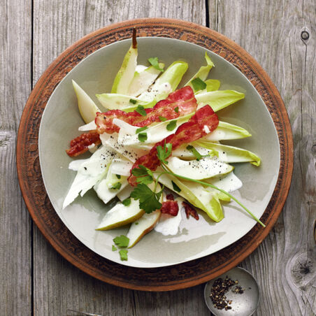 Für das Dressing die Crème fraîche mit Essig und Birnensaft glatt rühren. Mit Salz und Pfeffer würzen. Den Chicorée putzen, zerpflücken, die Blätter waschen, trocken schleudern und in schmale Streifen schneiden. Den Chicorée mit dem Dressing mischen und etwas ziehen lassen.