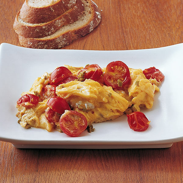 Die Eier mit der Sahne und Salz verquirlen. Die Butter in einer Pfanne zerlassen, die Tomaten darin unter Rühren bei mittlerer Hitze 2-3 Min. braten.