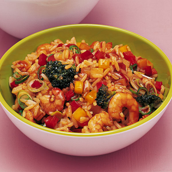 Frühlingszwiebeln waschen und in Ringe schneiden. Mit dem Reis und den Krabben zum Gemüse geben. Mit Salz, Pfeffer und Sojasoße abschmecken.