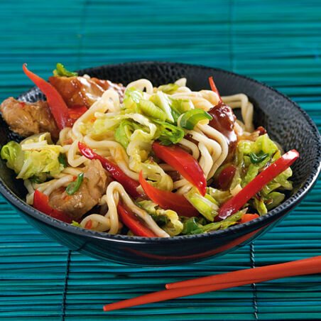 Die Brühe angießen, die Nudeln und das Fleisch unterheben und 3 Min. unter Wenden garen. Mit Sojasauce, Salz, Pfeffer und Chilisauce würzen.