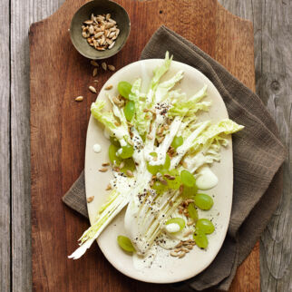 Immer eine erfrischende Kombination: Chinakohl mit Früchten! Zum Verfeinern werden noch Zuckerschoten und Walnüsse dazugegeben.