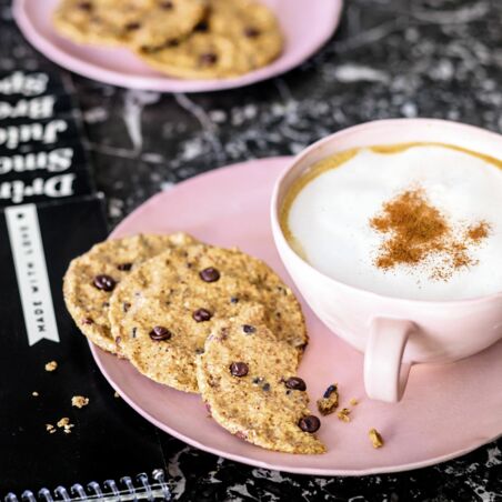 Jeweils eine kleine Portion Teig gleichmäßig in einem runden Ausstecher verteilen und festdrücken. Den Ausstecher entfernen und jeweils ein paar Choco Chips kreisförmig auf den Teigkreis drücken. Die Cookies im Backofen bei 50° (Umluft; Mitte) und leicht geöffneter Ofentür etwa 10 Std. oder im Dörrgerät bei 42° etwa 12 Std. trocknen lassen. Die Kekse wenden und das Backpapier entfernen. Die Cookies im Backofen etwa 8 Std. oder im Dörrgerät etwa 10 Std. weiter trocknen. Sie sind in einer verschlossenen Box im Kühlschrank etwa 6 Wochen haltbar.