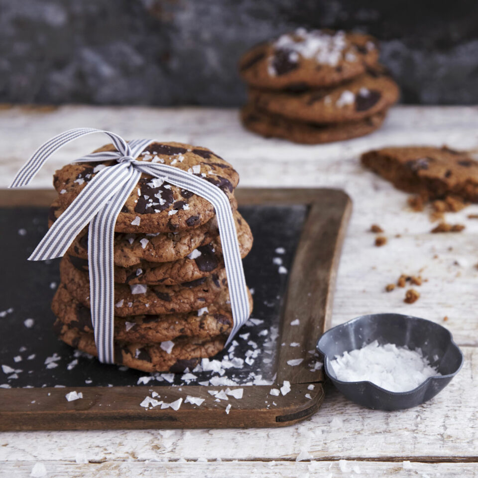 Den Backofen auf 175 ° vorheizen, zwei Backbleche mit Backpapier auslegen. Beide Zuckersorten, Ei und Eigelb in eine große Schüssel geben und mit den Quirlen des Handrührgeräts cremig schlagen. Die braune Butter unterrühren. Mehl und Natron auf die Masse sieben, das feine Meersalz dazugeben und den Teig rühren, bis er eine gleichmäßige Konsistenz hat. Zuletzt die gehackte Schokolade unterrühren.