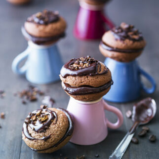 Den Backofen auf 160° vorheizen, zwei Backbleche mit Backpapier belegen. Für den Teig Butter und Puderzucker cremig rühren. Nacheinander Ei und Buttermilch vollständig einrühren. Mehl, Kakao, Backpulver und Lebkuchengewürz mischen und zügig unterheben. Mit dem Spritzbeutel ohne Tülle ca. 30 Teigportionen mit 3-4 cm Abstand auf die Bleche spritzen. Im Backofen (Mitte) jeweils ca. 15 Min. backen, danach vollständig abkühlen lassen.