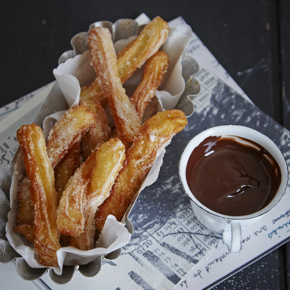 Den Churros-Teig kann man gut schon ein paar Stunden vorher zubereiten und bei Zimmertemperatur stehen lassen. Sie können ihn sogar schon vorher auf Backpapier spritzen und können ihn dann, wenn die Gäste kommen, sofort ins heiße Fett geben.