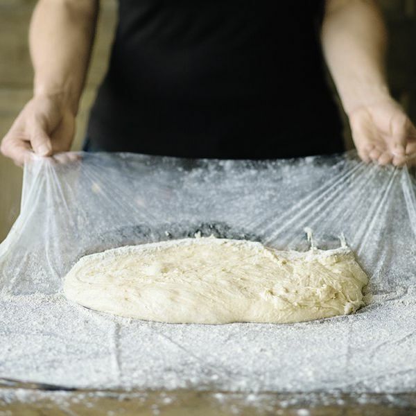 Den Teig ca. 12 Std. im Kühlschrank, dann 2 - 3 Std. bei Zimmertemperatur gehen lassen. Einen Bogen Frischhaltefolie großzügig mit Mehl bestäuben.