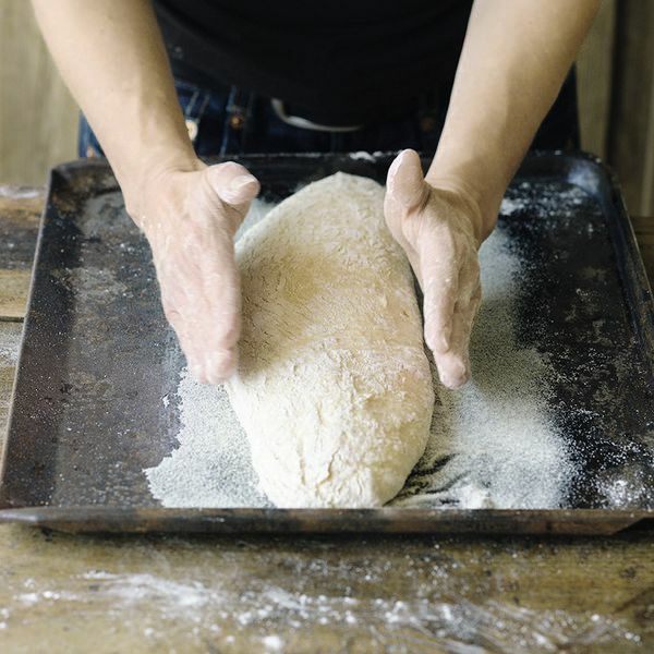 Den Teig mit einer Teigkarte aus der Schüssel lösen, auf die Folie geben, mithilfe der Folie länglich formen. Das Backblech einölen, mit Grieß bestreuen.